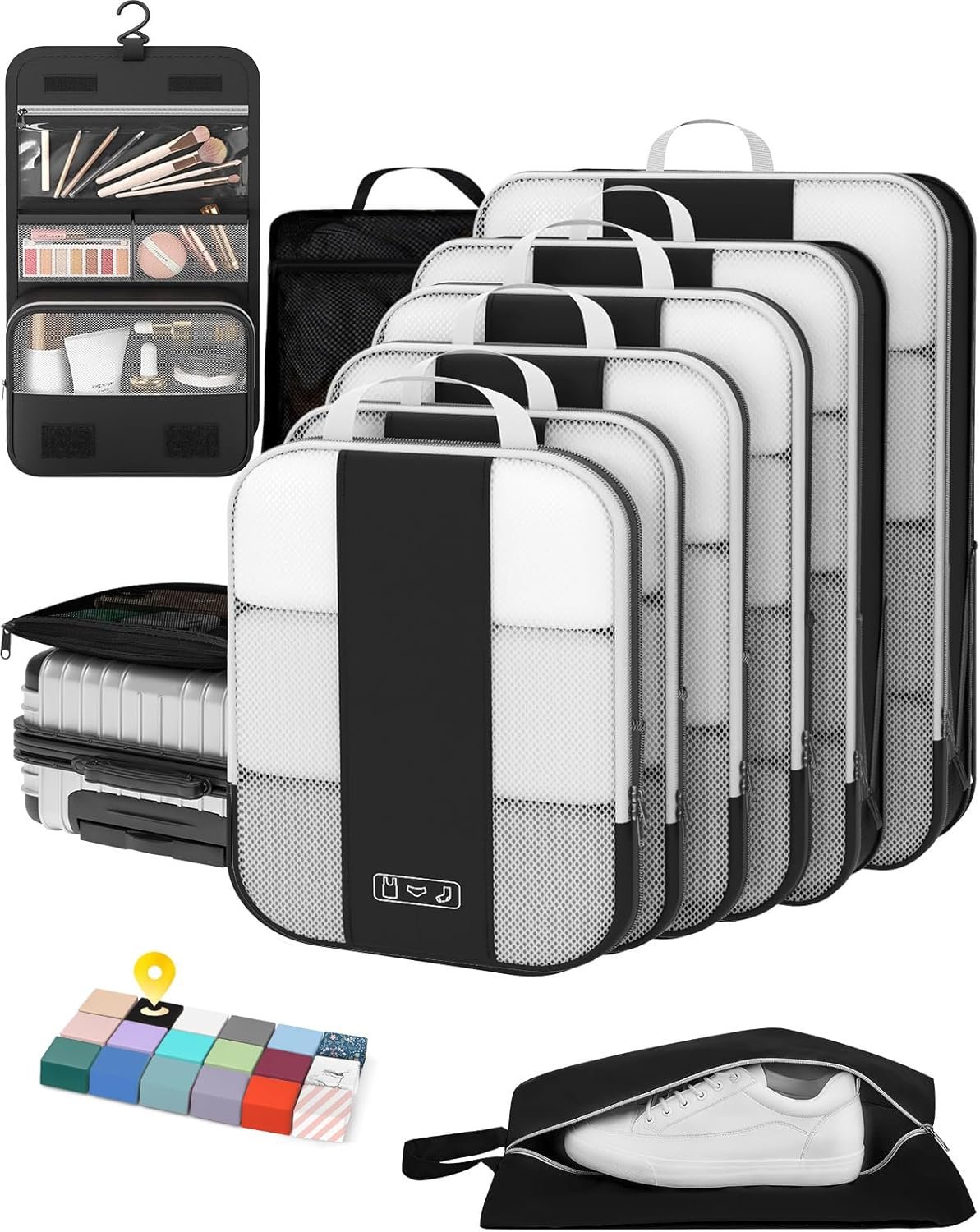 • All-in-One Travel Storage Solution – Say goodbye to chaotic packing! This comprehensive set includes four compression packing cubes in varying sizes (XL, L, M, S) to accommodate everything from bulky coats to delicate tops. Plus, enjoy added convenience with a hanging toiletry bag, shoe bag, backpack-style laundry bag, and versatile pouch—all designed to keep your luggage perfectly organized and clutter-free.