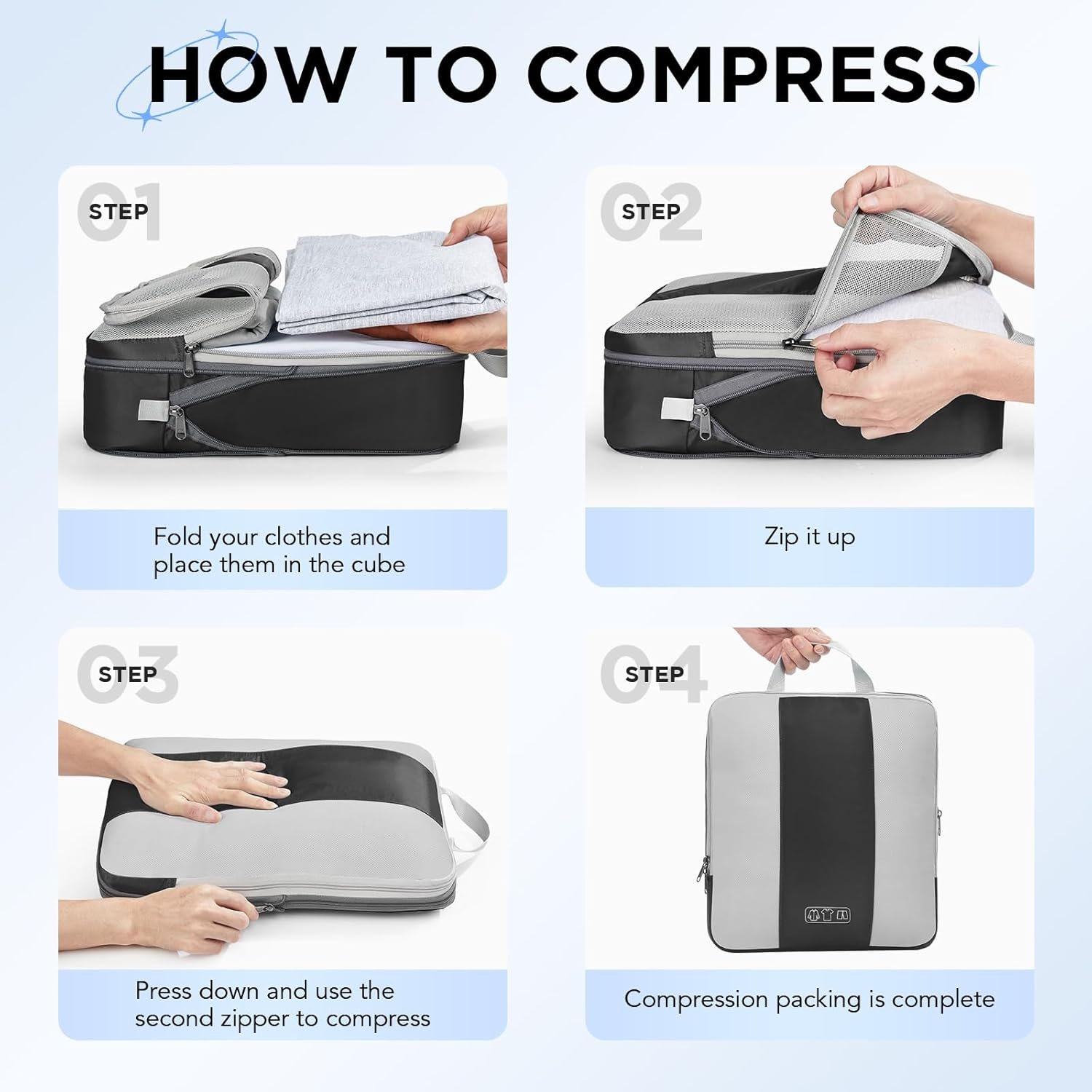 • Maximize Packing Efficiency – Make every inch of your luggage count! These compression cubes work like a mini vacuum sealer, using an extra outer zipper to reduce bulk and create more space. Pack more clothes without sacrificing options—your favorite outfits, now travel-ready.