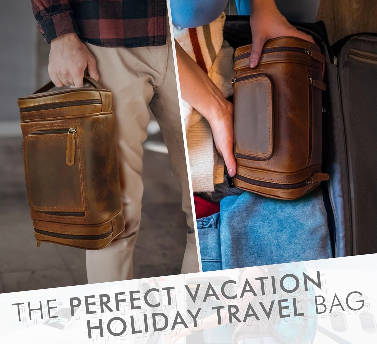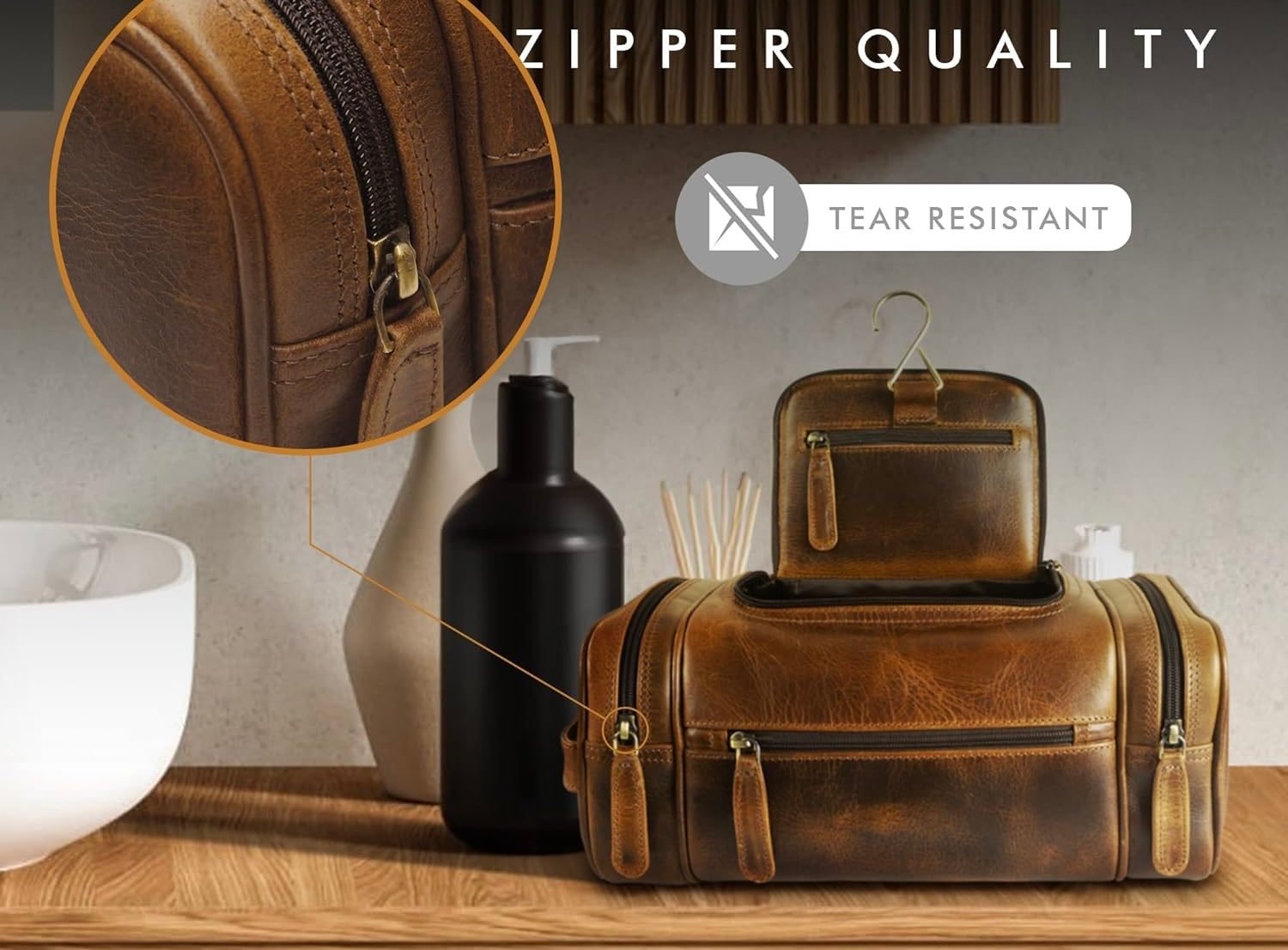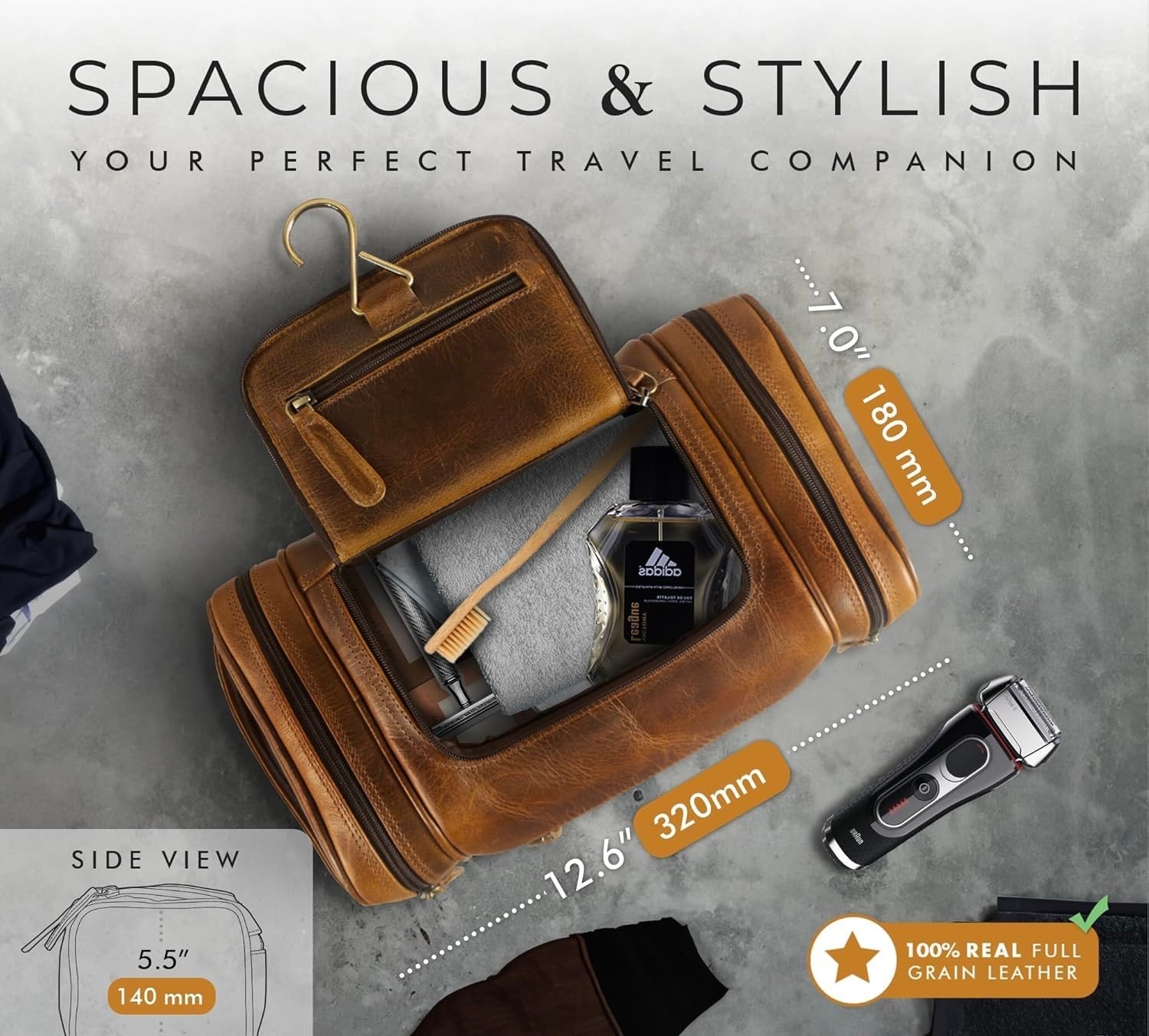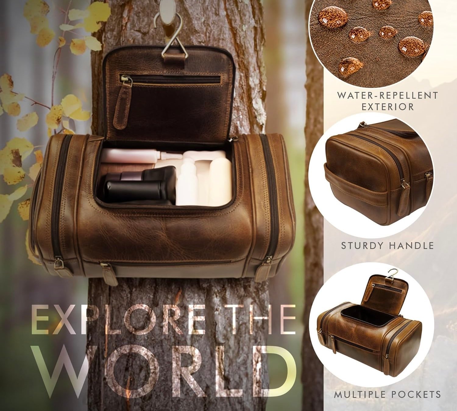 - Premium Leather: Crafted from durable, water-resistant leather that develops a rich patina over time. Note that full-grain leather always displays distinctive natural characteristics. Actual colors may vary slightly from images shown. A waterproof inner lining protects toiletries from moisture and spills—easy to clean.